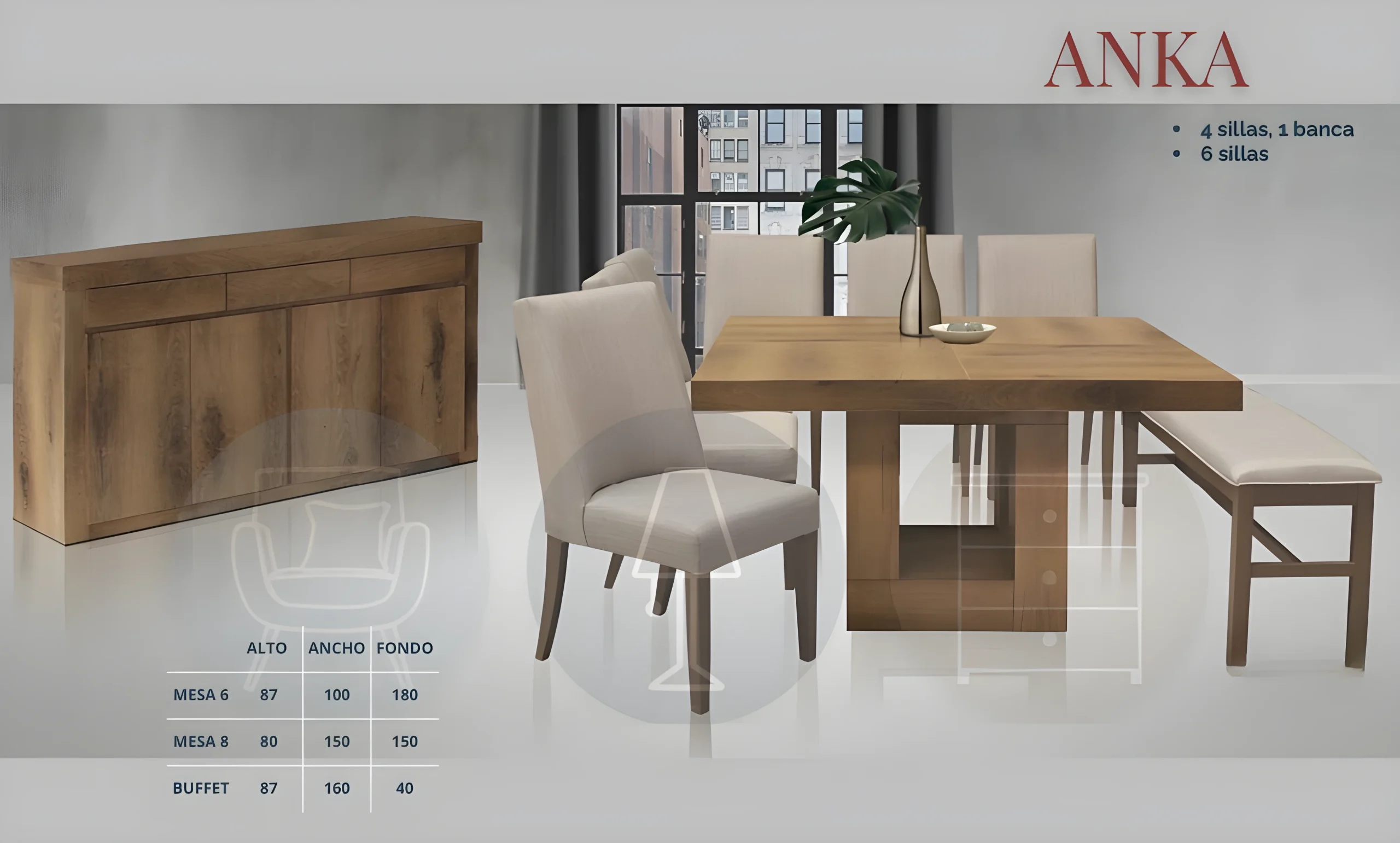 Comedor 4 sillas, 1 banca, Comedor 6 sillas, Comedor 4 sillas, 1 banca, Buffet, Comedor 6 sillas, Buffet
